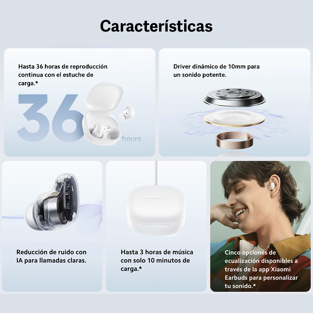Xiaomi Redmi Buds 6 Play con una batería de hasta 36 horas de carga y sonido potente gracias a su driver dinámico de 10 mm.