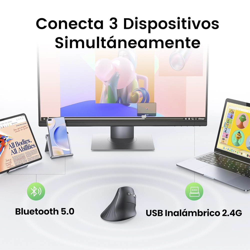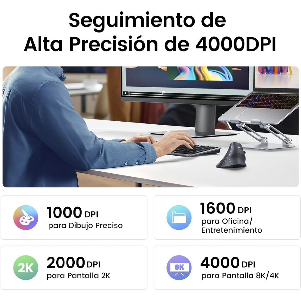 El Mouse Bluetooth Ugreen Ergonomico MU008 que ayuda a reducir la tensión en la muñeca. Ofrece conexión dual (Bluetooth 5.0 y USB 2.4 GHz), clics silenciosos, DPI ajustable hasta 4000 y es compatible con Windows, macOS, Linux y Android.