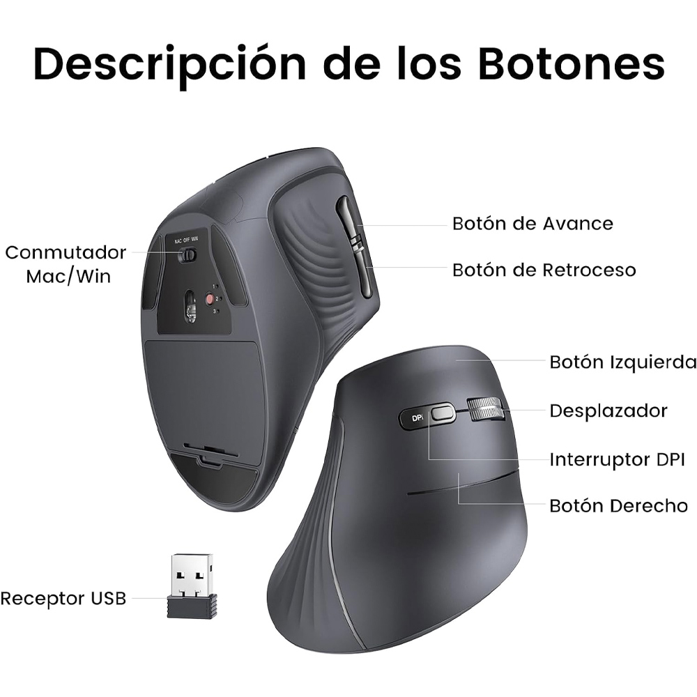 Mouse vertical inalámbrico UGREEN, ergonómico y silencioso con doble conexión (Bluetooth/2.4Ghz), 4 Niveles de DPI y compatible con Windows, Mac y Linux.