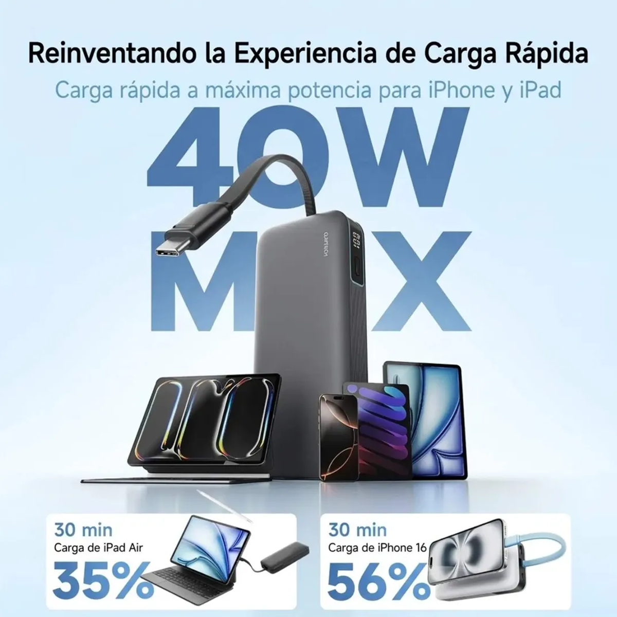 • Potencia Real de 40W: Carga rápida bidireccional (carga tus equipos a 40W y se recarga a sí mismo a 40W).
