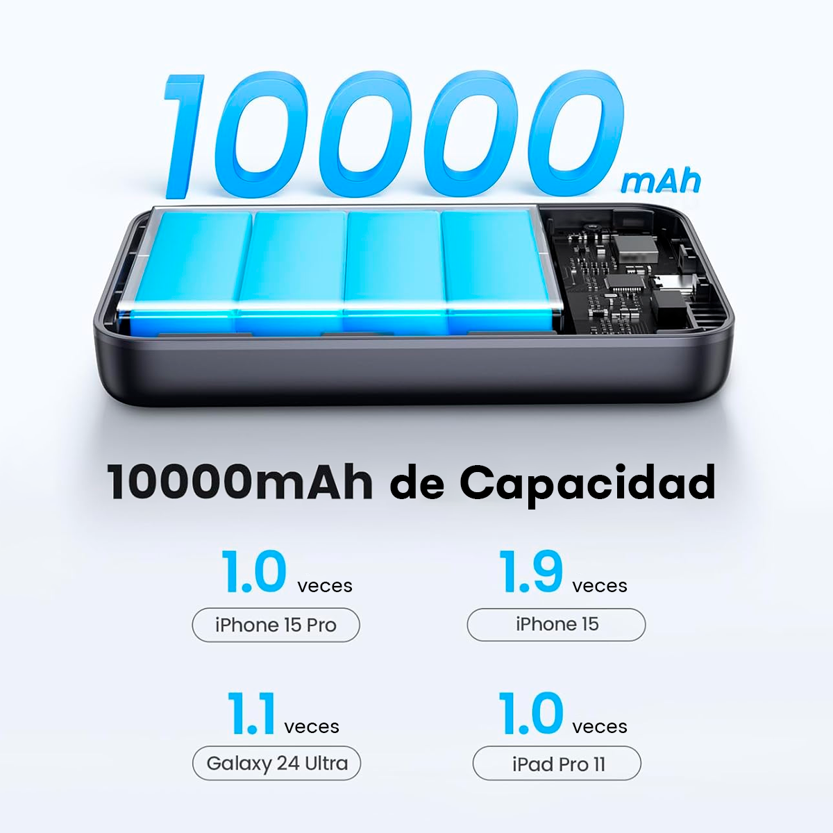 Su batería interna de 10 000 mAh permite recargar un smartphone de 0 % a 100 % varias veces dependiendo del modelo, siendo una excelente opción para viajes, trabajo y días de uso intensivo.
