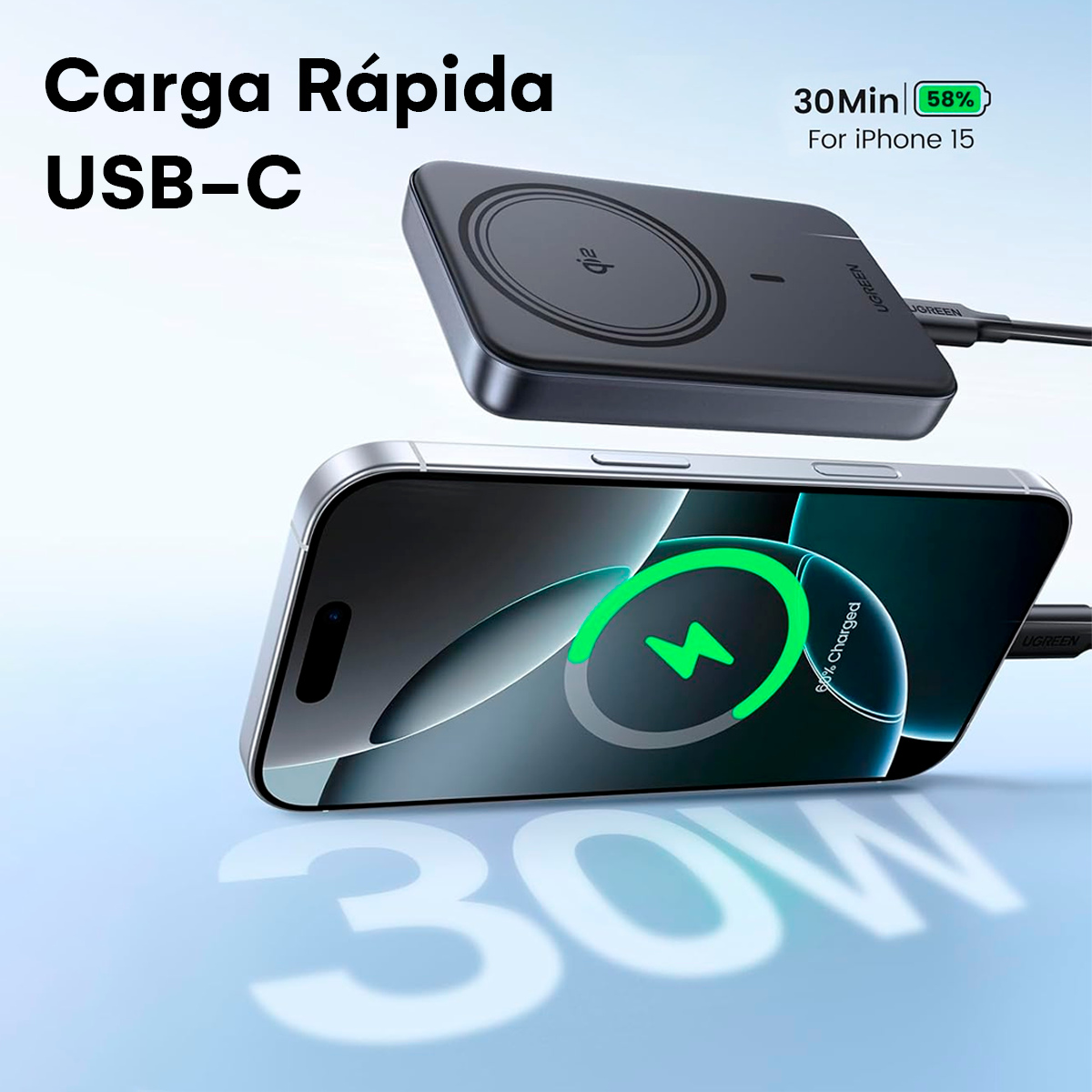Además de su carga inalámbrica, incluye un puerto USB-C capaz de entregar hasta 30 W, ideal para recargar rápidamente tu iPhone, Android, earbuds o incluso pequeños dispositivos electrónicos compatibles con carga rápida.