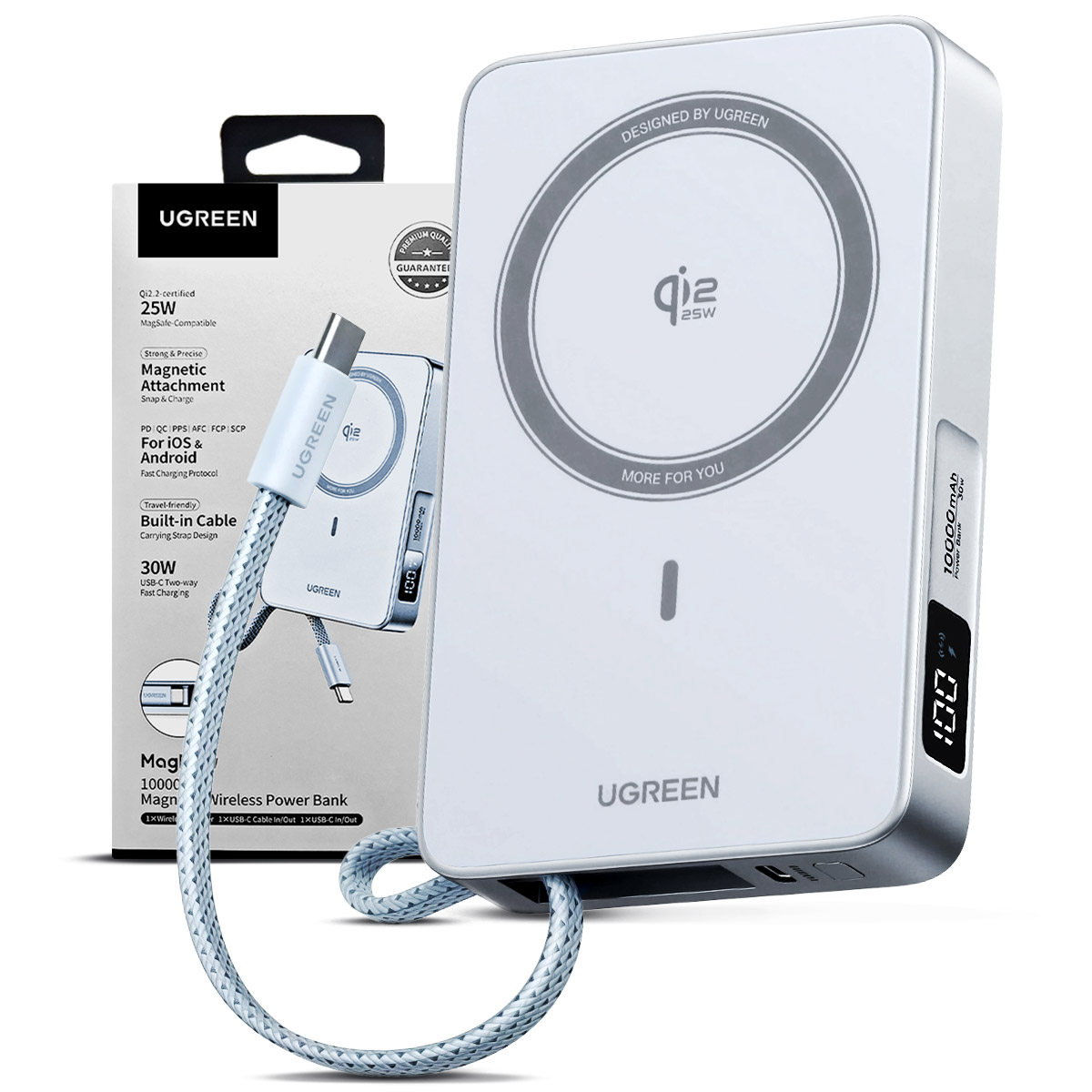 El power bank UGREEN PB773 combina 10 000 mAh de capacidad, carga rápida por cable de 30 W y carga inalámbrica magnética Qi2 de 25 W, con cable integrado y imanes fuertes para sujetar el móvil fácilmente y energía confiable en movimiento.