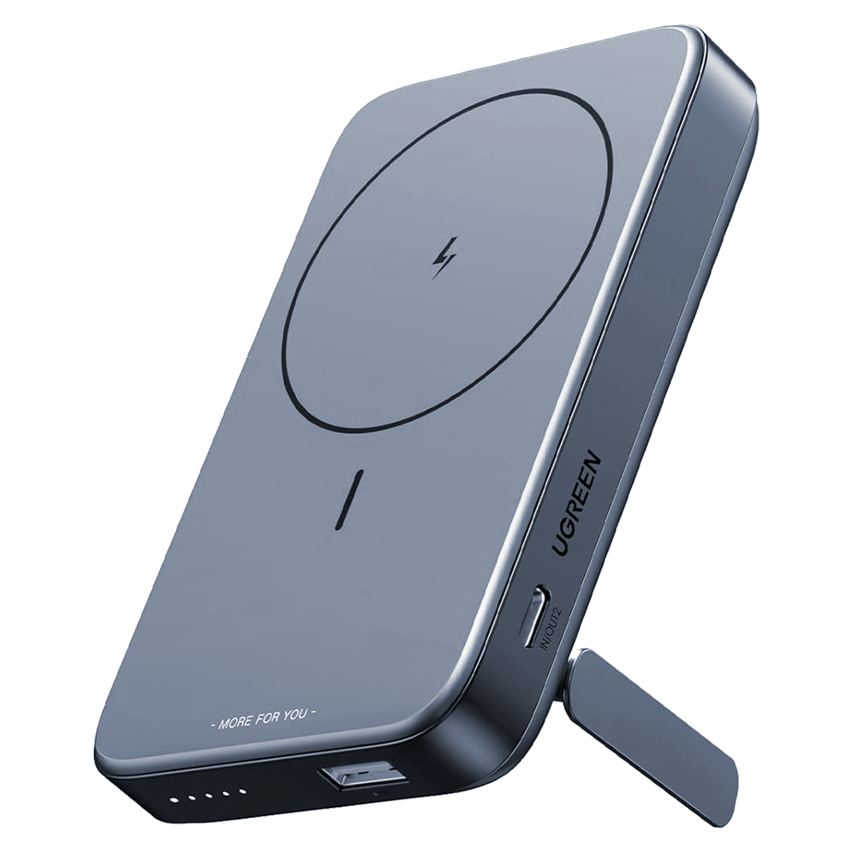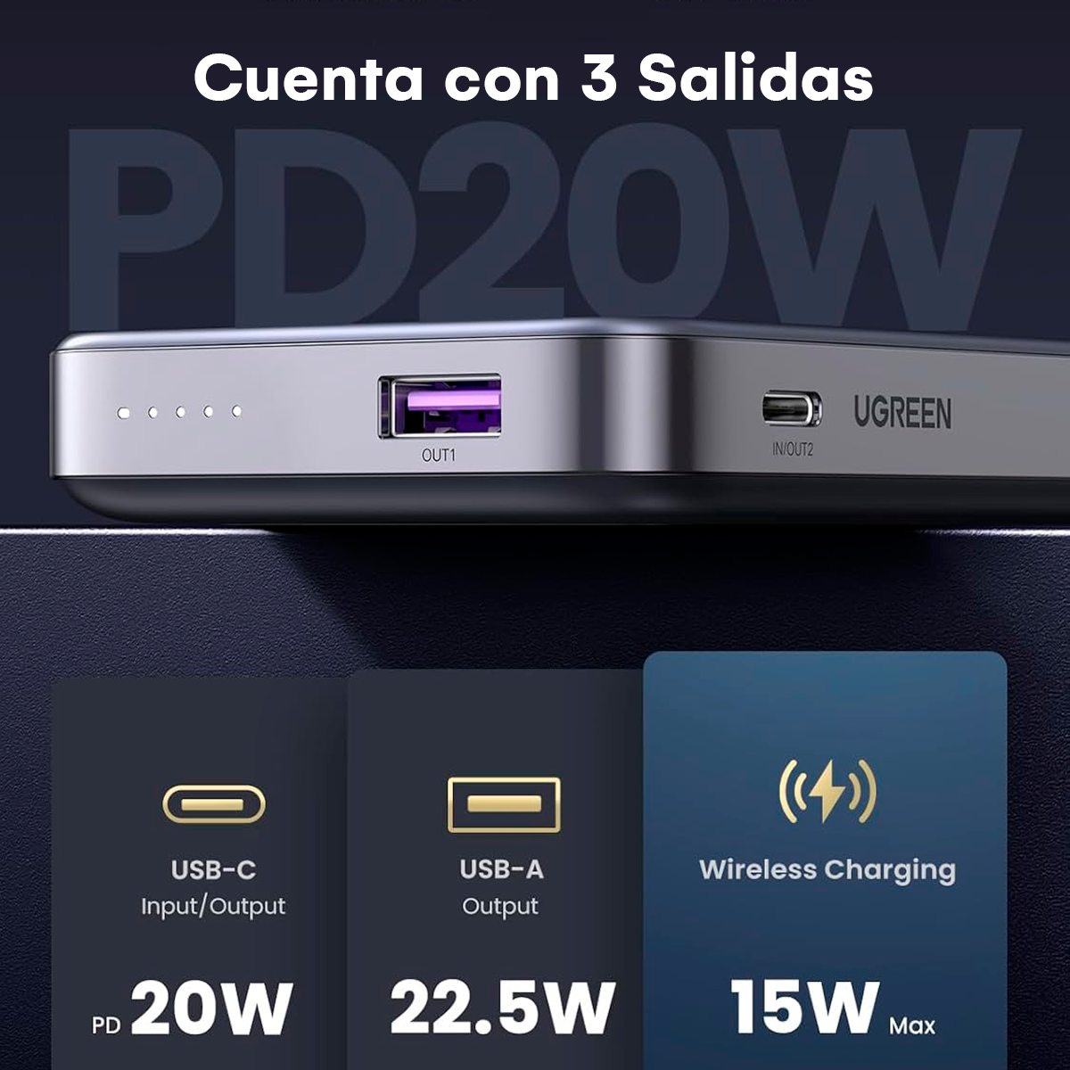 Power bank UGREEN PB206 de 10,000mAh con carga inalámbrica magnética (7.5W iPhone / 15W Android), carga rápida 20W USB-C, soporte plegable y carga simultánea de 3 dispositivos.