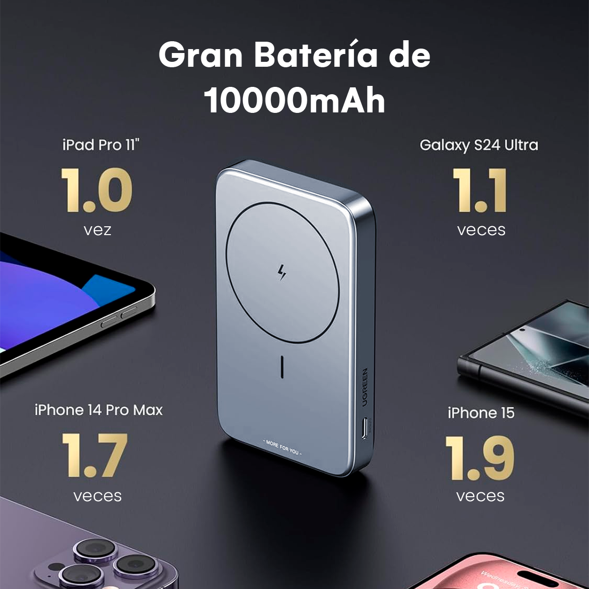 Con una capacidad de 10,000 mAh, el UGREEN PB206 puede cargar un iPhone 15 aproximadamente 2.3 veces o un iPhone 15 Pro Max alrededor de 1.7 veces, ofreciendo energía suficiente para todo el día.