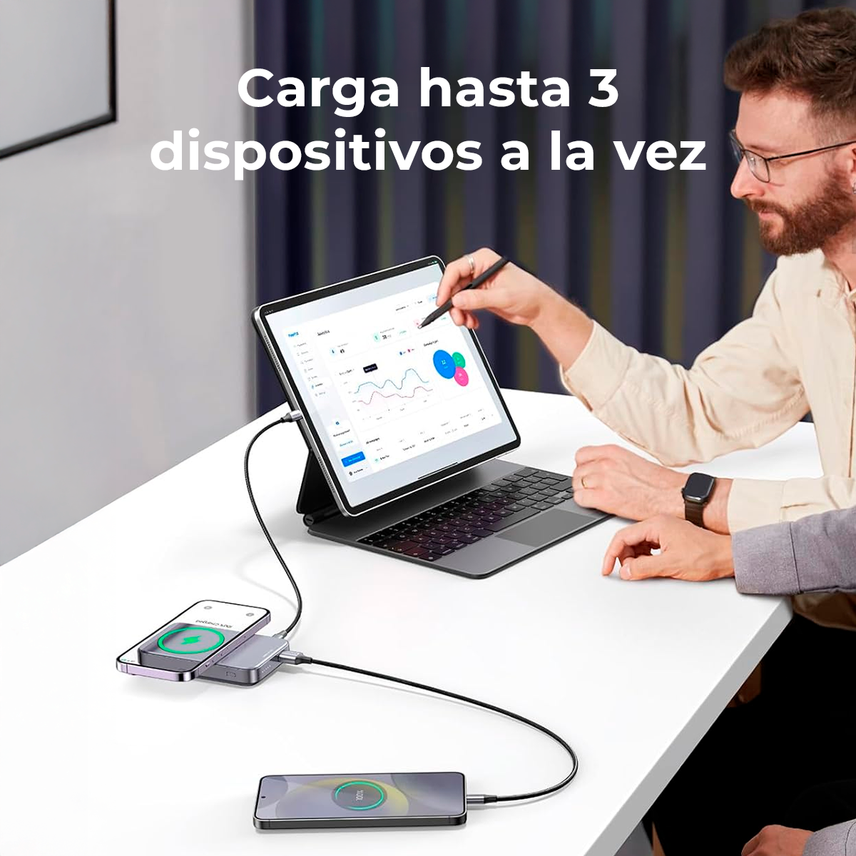 Gracias a sus múltiples salidas (USB-C, USB-A y carga inalámbrica), puedes cargar hasta tres dispositivos al mismo tiempo, optimizando tu productividad en todo momento.