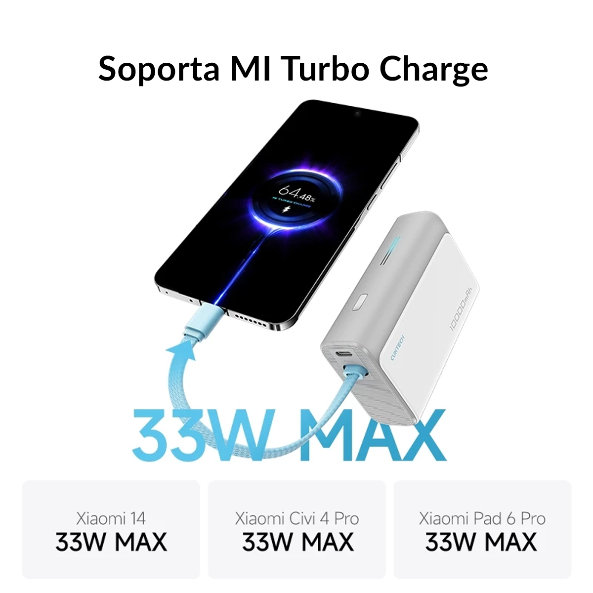 No te dejes engañar por su tamaño. Con 10,000 mAh de capacidad y una salida máxima de 33W, el Cuktech LPB100 es capaz de cargar un iPhone 15 al 50% en aproximadamente 30 minutos. Es totalmente compatible con protocolos de carga rápida como Power Delivery (PD 3.0), Quick Charge 3.0 y PPS, lo que garantiza una carga óptima para dispositivos Xiaomi, Samsung y Apple.