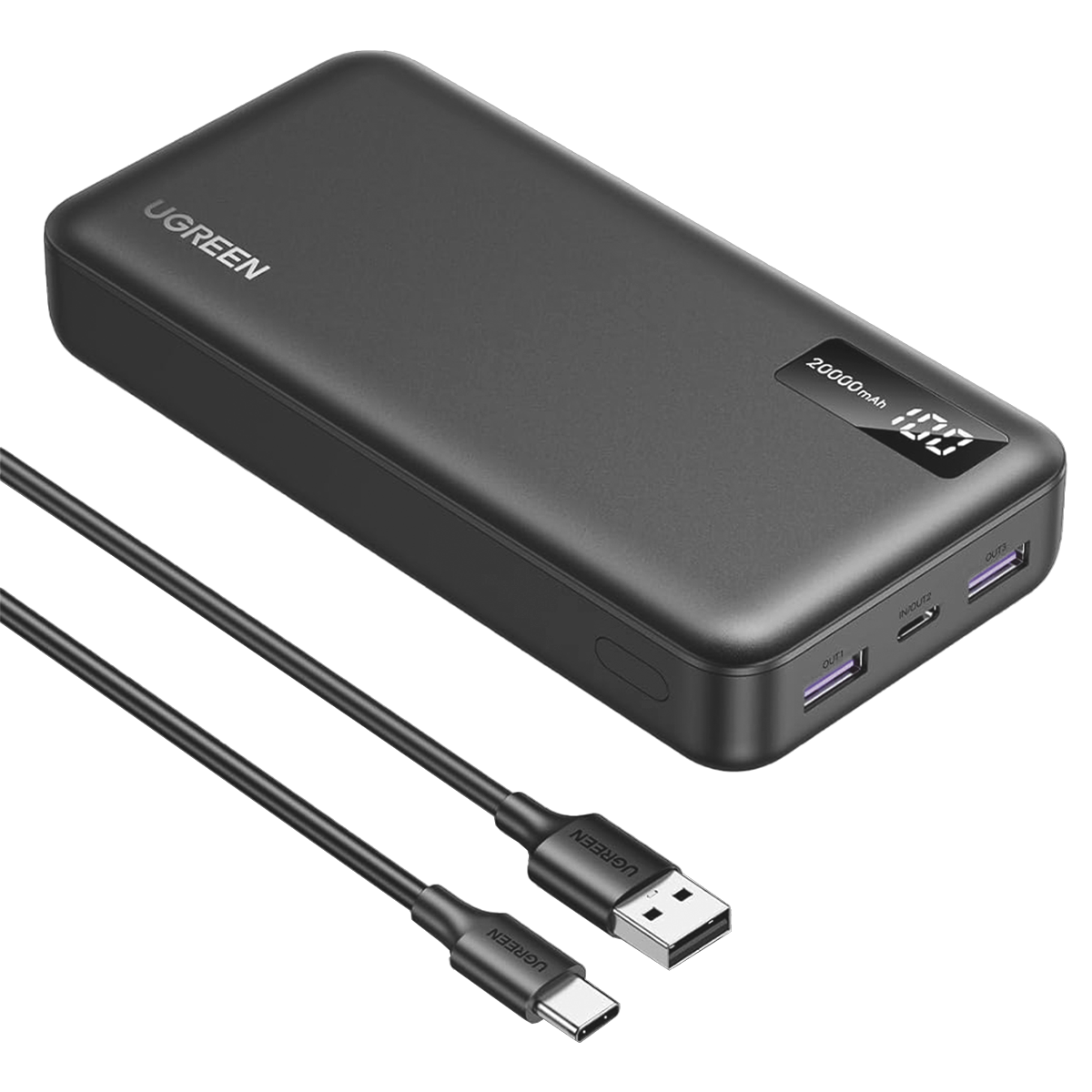 Power Bank UGREEN PB312 de 20,000mAh con carga rápida de 22.5W, 3 puertos, pantalla LED y protección múltiple. Ideal para cargar varios dispositivos a la vez.