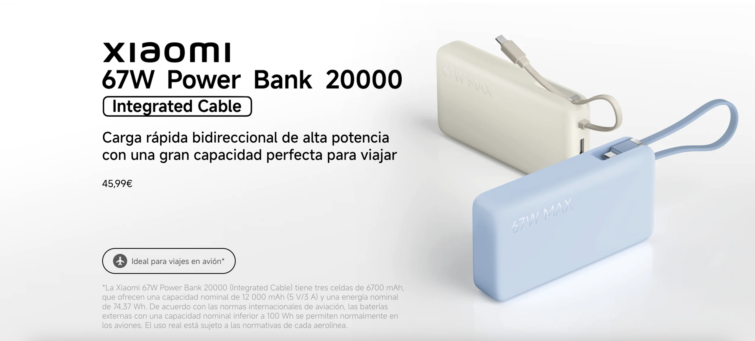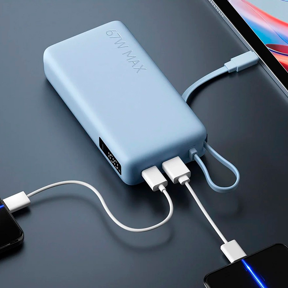 La Xiaomi 67W Power Bank 20000 (Integrated Cable) es una batería portátil de gran capacidad con carga rápida de hasta 67 W, cable USB-C integrado, pantalla digital y carga eficiente para múltiples dispositivos en viaje y uso diario.