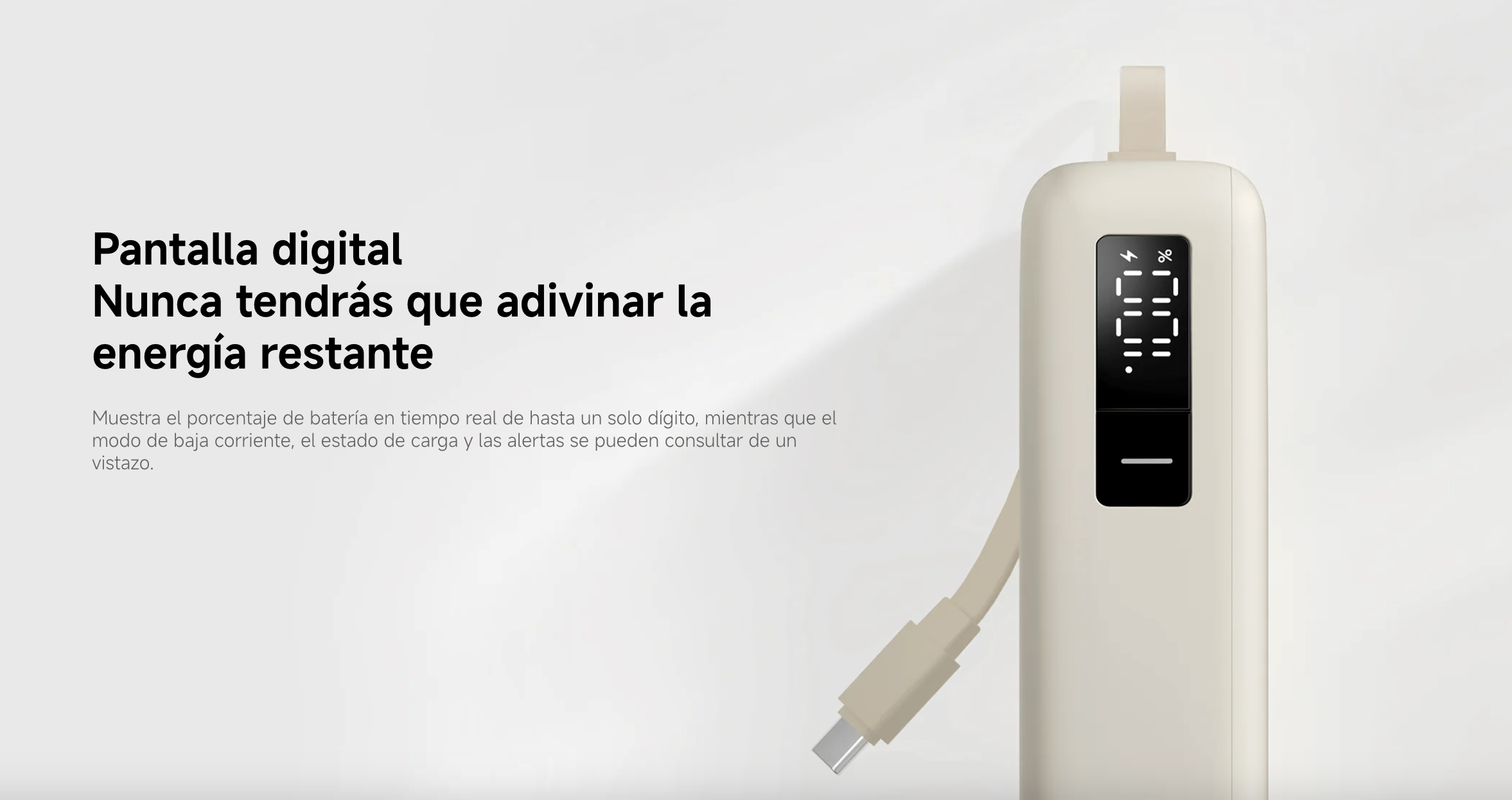 Una pantalla digital te muestra el porcentaje exacto de batería restante y te ayuda a monitorizar el estado de la carga de forma sencilla, sin adivinar cuánto le queda de energía.